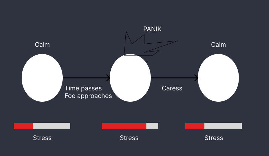 As it stresses out from being out of its incubator, it will start screaming (both in game and IRL), putting the player in danger of being spotted. To calm it down, they will have to gently hold it in their arm and caress it. The controller will detect the caresses through a microphone placed under the (synthetic) skin.
